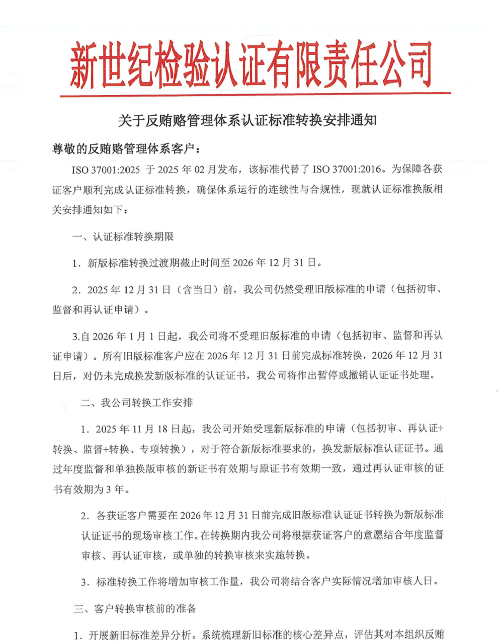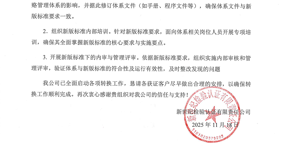 2.各獲證客戶需要在2026年12月31日前完成舊版標準認證證書轉換為新版標準認證證書的現場審核工作。在轉換期內我公司將根據獲證客戶的意愿結合年度監(jiān)督審核、再認證審核,或單獨的轉換審核來實施轉換。